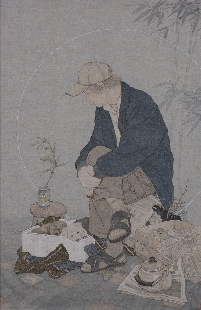 이마를 맞댄 채 옹기종기 붙어 있던 허름한 집들이 헐리기 전의 봉의산 주 변 다양한 모습들이 담긴 〈봉의산도〉와 자리를 옮기기 전 재래시장의 모습 을 담은 〈풍물시장〉, 조선 풍속화를 보는 듯한 〈나물캐기〉와 〈천렵〉, 도시화의 그늘이 드리운 골목길에 아이들을 풀어놓고 지금은 잊힌 놀이들을 하 게 만든 〈아이들놀이〉는 역사화(歷史畵historical painting)로도 기릴 만한 작품들이다. 이들이 현대화에 밀려나 사라지거나 옮겨간 모습들을 담고 있 다면, 이후에 차례로 그려지는 세 개의 축권 〈그의 꿈속에 나오는〉과 〈아버 지의 꿈〉, 그리고 청(淸) 건륭연간에 예술혼을 살랐던 이른바 양주팔괴(揚 州八怪)를 빗대어 춘천의 여덟 괴짜화가를 한 화폭에 담은 〈춘주8괴〉는, 역사로서의 시간과 개인사로서의 시간이 어떻게 다르고 같은지에 대한 화가 의 생각을 읽게 하거니와 화가는 시간이라는 관념을 어떻게 그림으로 형상 화하는지를 보여주는 실험적 성격도 가지고 있다.